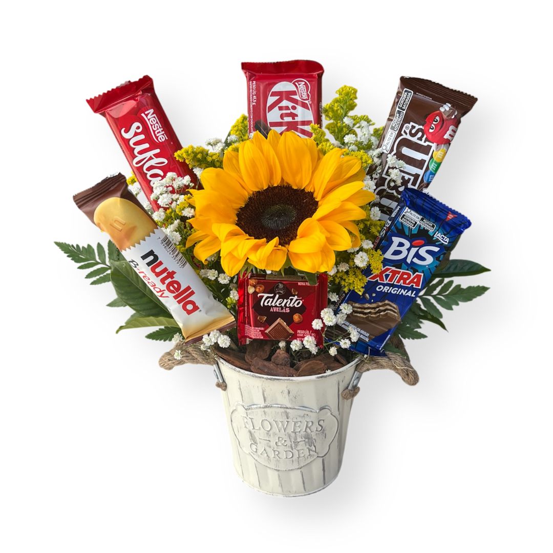 girassol — símbolo de alegria e positividade — com uma seleção deliciosa dos chocolates mais amados.