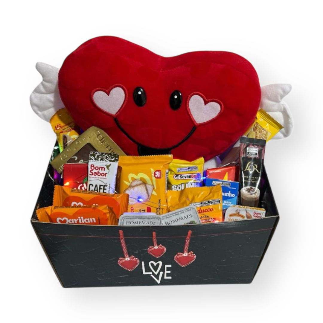 Montada em um charmoso cachepô de papel cartonado e acompanhada de uma doce pelúcia de coração, esta cesta combina romantismo e aconchego em cada detalhe.