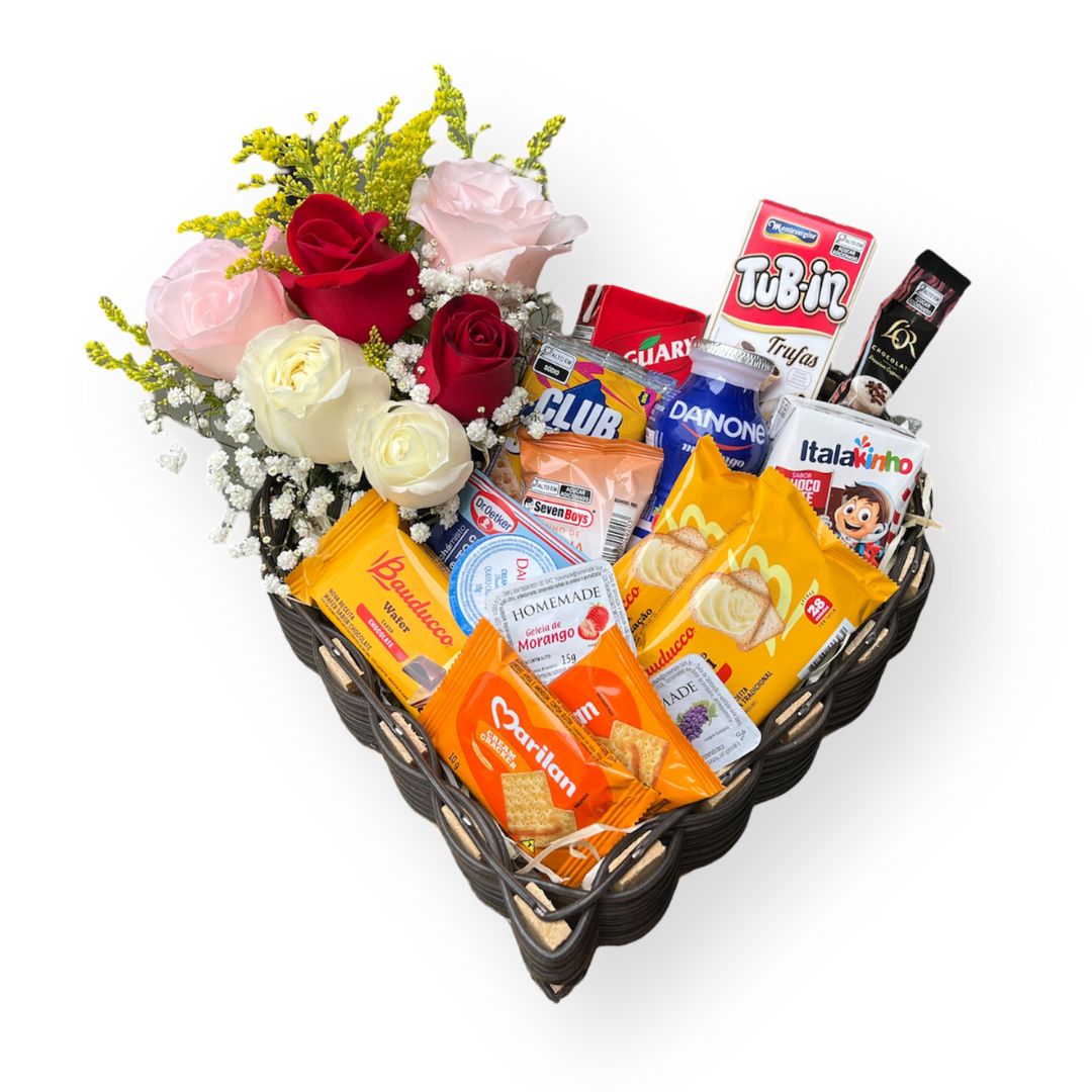 🌅 Cesta de Café da Manhã Apaixonado — cachepô coração com arranjo de rosas e seleção de delícias para começar o dia com amor. Peça agora!
