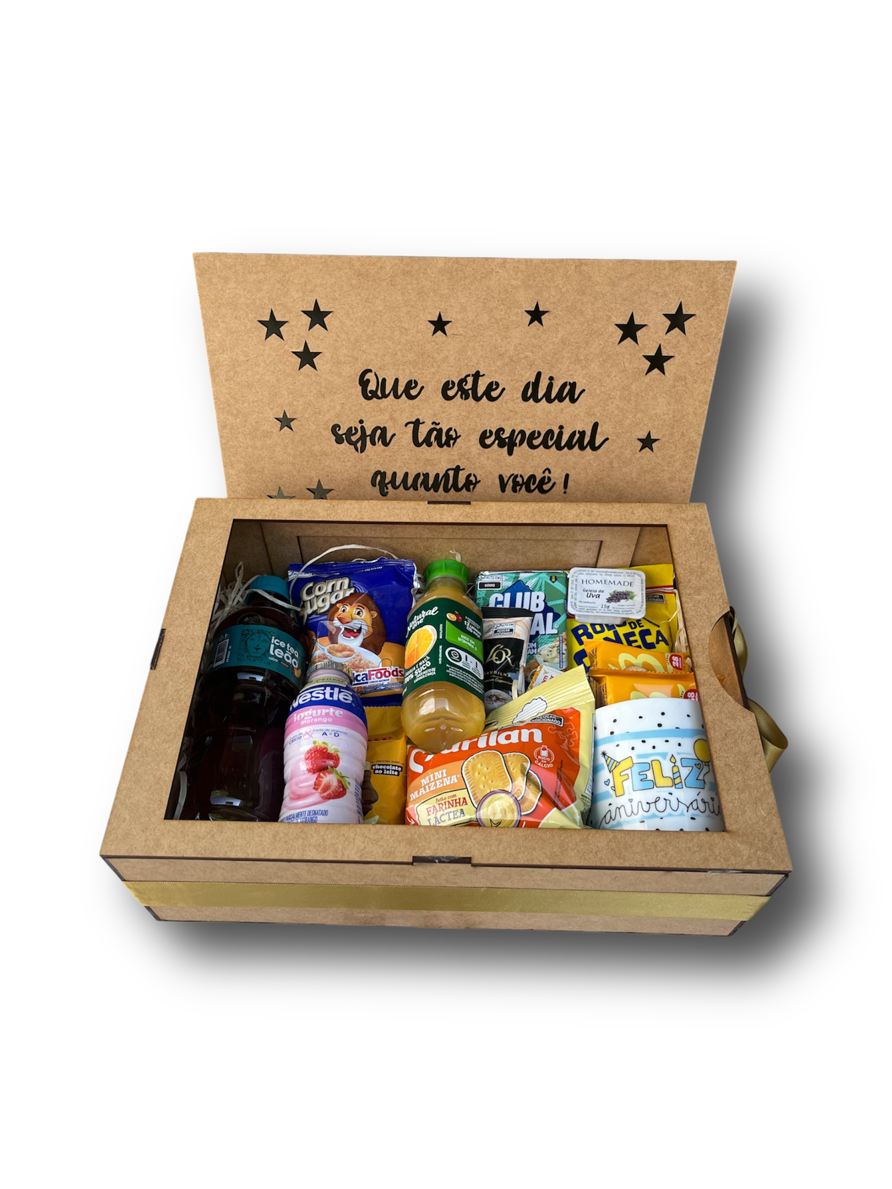 Cesta de Café da Manhã Caixa Feliz Aniversário - uma deliciosa e exclusiva caixa em MDF, recheada de produtos deliciosos.Surpreenda o Aniversariante com uma Deliciosa Caixa Surpresa de Café da Manhã. ,